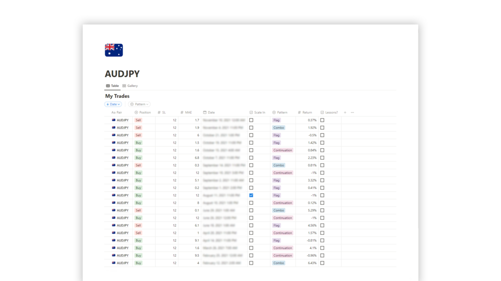 • Direction, SL, MAE (Maximum Adverse Excursion), Date, Scale Ins, Pattern and Return.