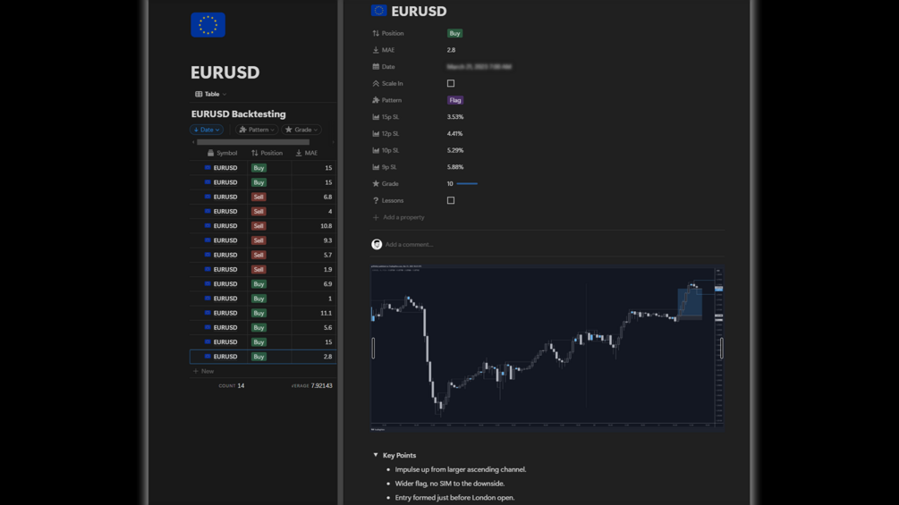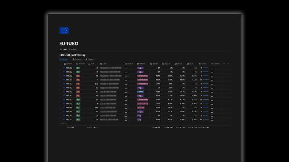 - Direction, SL, MAE (Maximum Adverse Excursion), Date, Scale Ins, Pattern and Return.